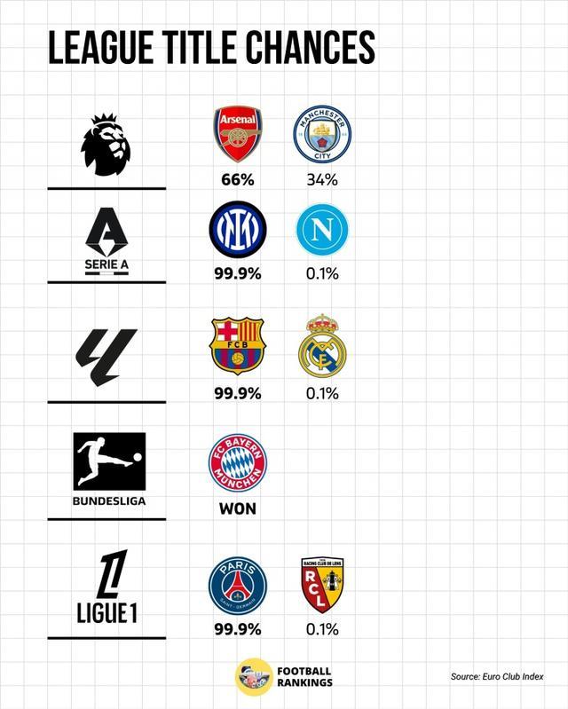 直播吧04月27日讯 欧洲五大联赛即将迎来五月份的冲刺收官阶段,Football Rankings引用Euro Club Index的数据,罗列出了五大联赛的最新夺冠概率。